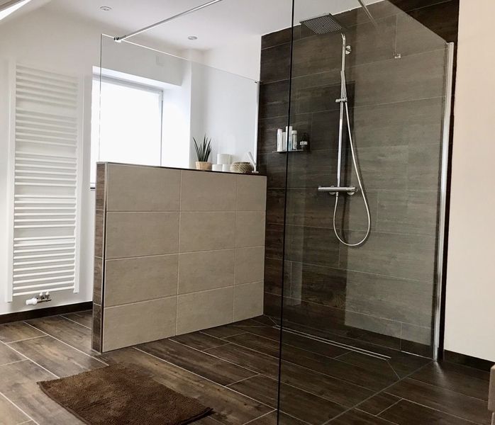 Neubau Badezimmer im 1. Stock eines Wohnhauses mit wunderschönem Waschtisch und toller Lösung des Spiegeleinbaus in die Dachschräge. Kundenwunsch: Große begehbare Dusche mit Glaswänden