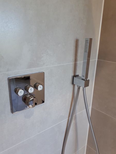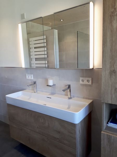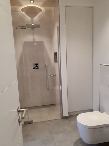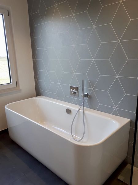 Neubau eines Badezimmers und Gäste WC in einem Einfamilienhaus mit freistehender Badewanne und begehbarer Dusche. Das neue Badezimmer und das Gäste WC mit einer zusätzlichen Dusche sind nun Zimmer mit Wohlfühlcharakter.