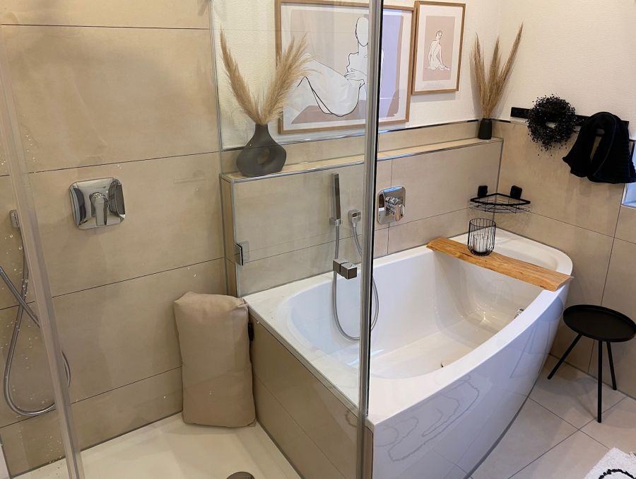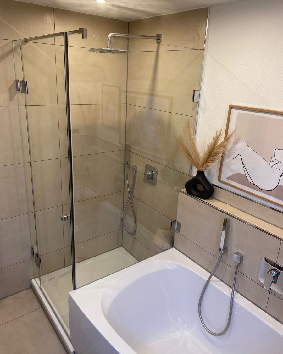Unser Kunde hatte den Wunsch eine Badewanne sowie Dusche auf kleinem Raum unterzubringen. Diesem Wunsch kamen wir sehr gerne nach und durften ein wunderschönes Badezimmer sowie Gäste WC mit modernen Armaturen und stylischen Details zaubern. Die Farben der Fliesen und der sanitären Anlagen sowie Armaturen ergänzen sich perfekt. Kleiner Raum - Große Wirkung.
